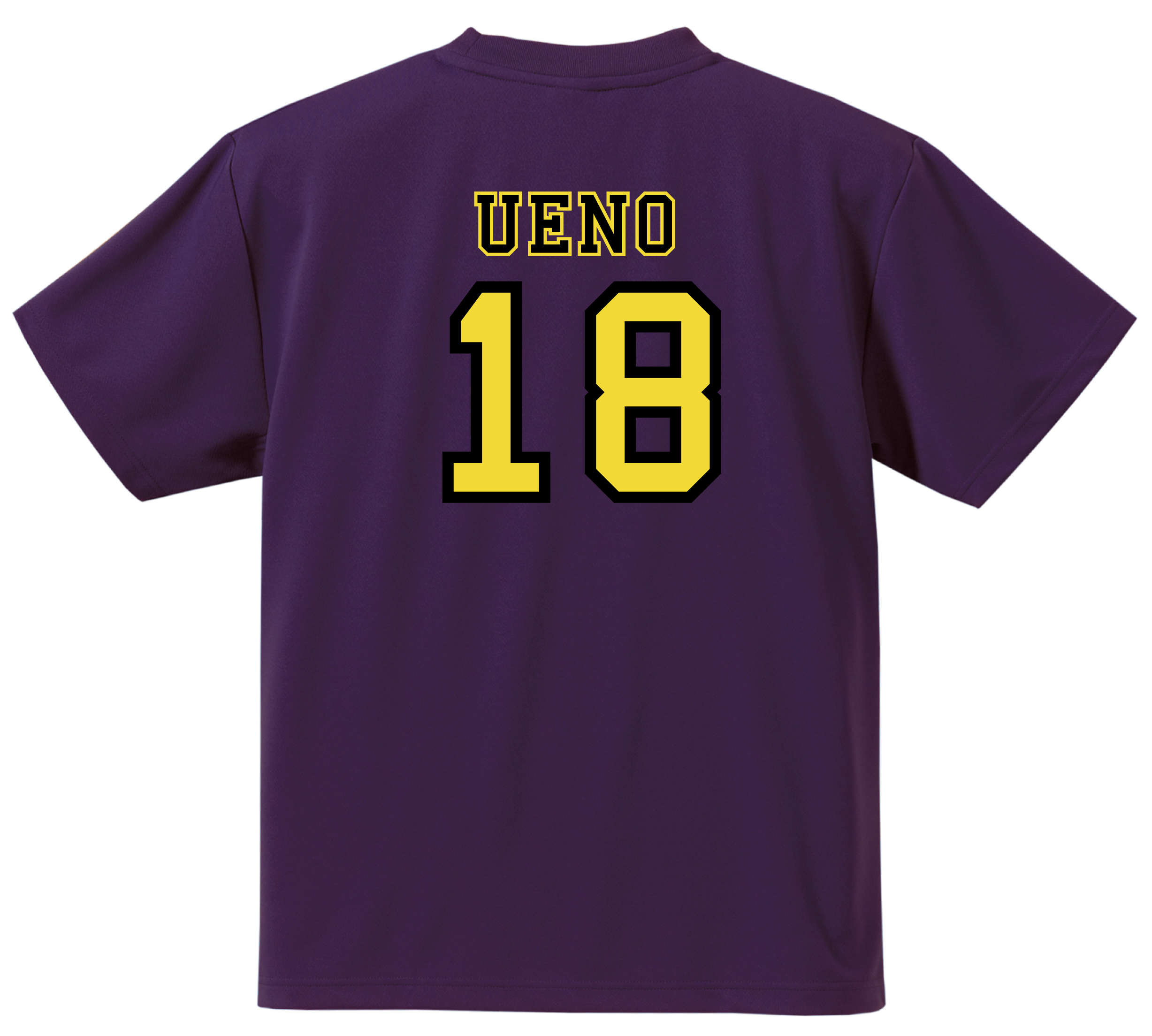 パープルの応援Tシャツの背面に選手の名前と背番号をプリントしたナンバーTシャツです。