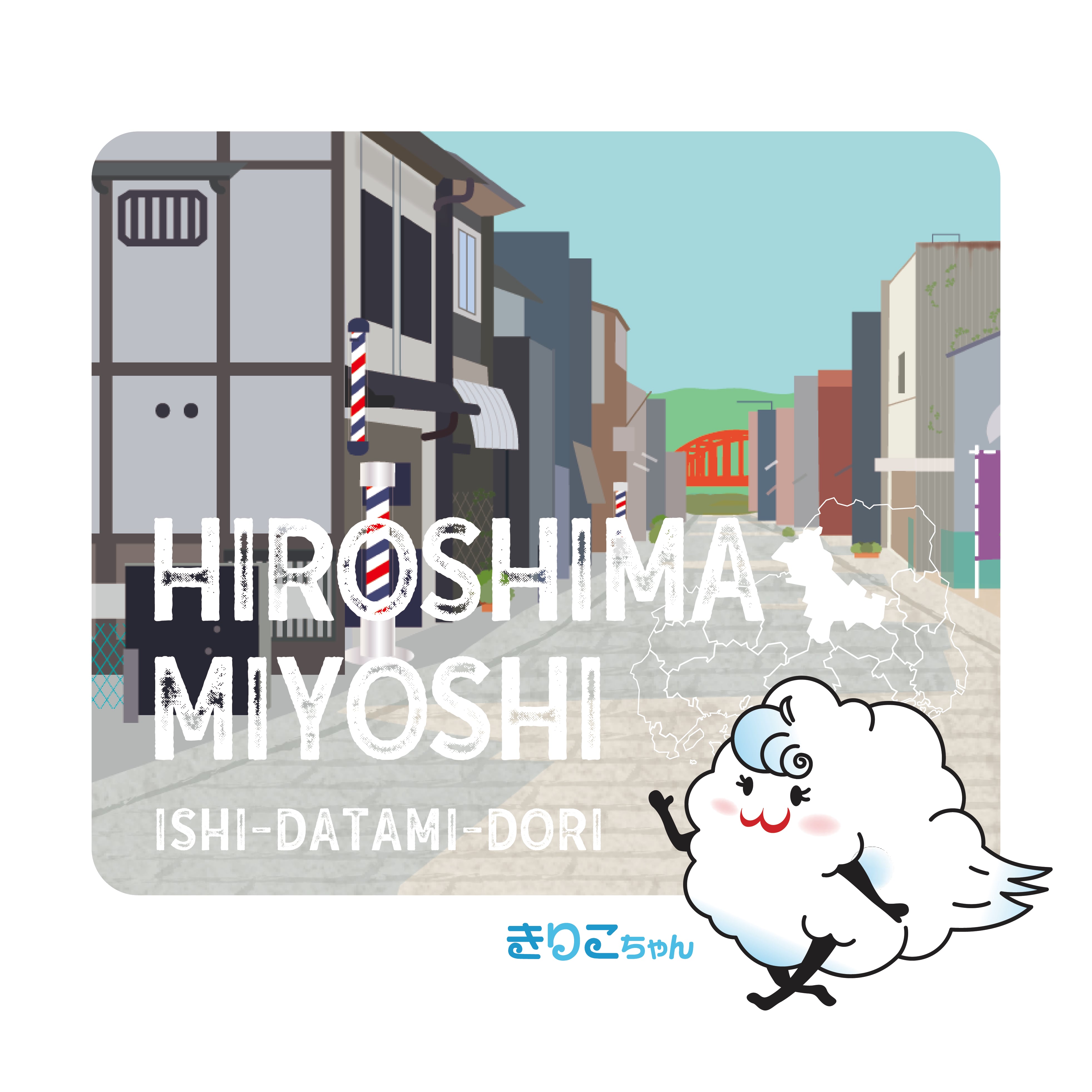三次町の風景に、きりこちゃんがふんわりと寄り添う可愛らしいデザインに仕上げました。